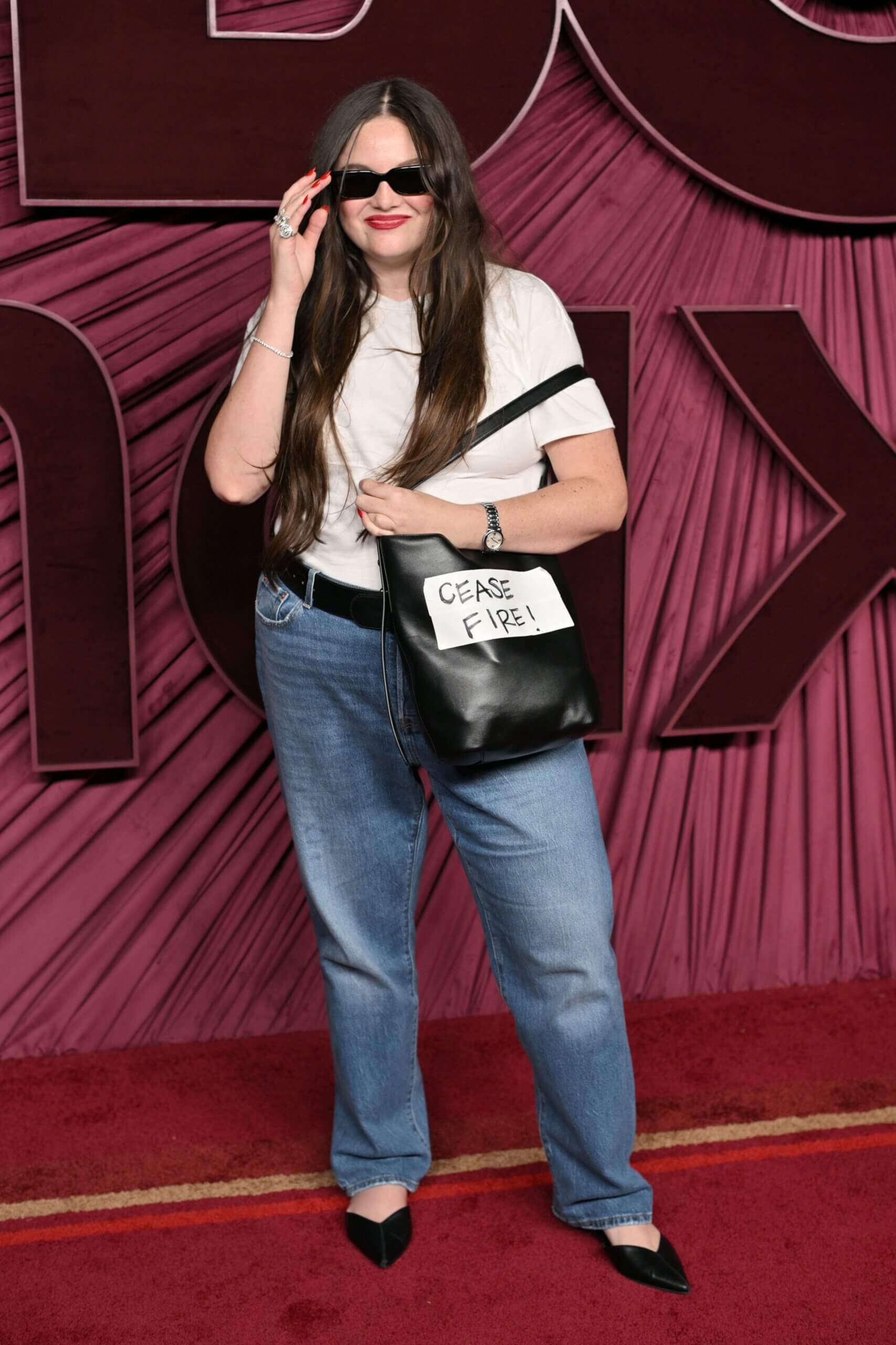 Einbinder’s win landed amid a carpet already loaded with signals. Her co-star Meg Stalter arrived in jeans and a white tee, then lifted a black handbag scrawled with “Cease Fire!” When asked why, she told Variety it is “the most important to stick up for people and for peace,” adding, “We have to use our platforms. What’s the point of being at these big events if you’re not going to use your privilege?”