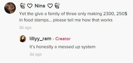 With 668 comments, many expressed their frustrations with the video. One person noted that this is the “problem with this country.” Others noted their own situations, as one expressed that “but my family of 4 doesn’t qualify because we went over the limit by $1. This system is a joke.” The original creator seemed to agree with this statement, as she responded to several comments noting that she believes the system was messed up.